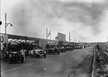 Once again, the race began under grey clouds and drizzling rain.[1][4] First away were the DuPont and the Lagonda but Birkin, in the big Bentley Speed Six, was in the lead under the Dunlop bridge.[4] Left at the line was the D’Yrsan with Trillaud losing seven minutes pushing the car up the road trying to get his engine fired (technically a disqualification offense).[14][4] At the end of the first lap Birkin had already set a new lap record of 7m57s, from a standing start.[19] The other Bentleys of Clement, Kidston and Benjafield were in formation behind, chased by the Stutzes of Bouriat and Eyston.[1] Howe was next, though he soon moved up as the rain stopped to join his teammates, with Benoist and Mongin in their Chryslers and Moran's DuPont making up the top ten.[20] Already there was a sizeable gap (over a kilometre) back to the Lagonda leading the smaller cars.[1]
