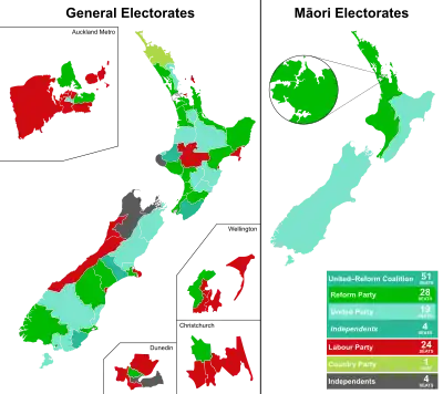 - ↑ The Reform and United parties could not agree on an official coalition candidate for the Timaru electorate, so neither Armstrong (Reform) nor Herbert Hall (United) were official candidates, and many sources show them as Independents