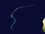 On October 17, a stationary front positioned over the eastern Atlantic began to dissipate, and a large area of low pressure began to form along the front boundary.[2] The disturbance intensified to tropical storm strength at 0000 UTC on October 18 about 1,220 mi (1,965 km) northwest of the westernmost islands of Cabo Verde,[3] after losing baroclinity.[2] As it moved towards the north, the system slowly intensified to an estimated peak intensity of 70 mph (110 km/h) at 0600 UTC on October 19,[3] as suggested by a nearby ship that also reported 70 mph (110 km/h) winds.[2] At the same time, the storm also turned eastward, and subsequently began to weaken. The system degenerated to tropical depression strength on October 21, and dissipated shortly thereafter around 415 mi (670 km) southwest of the central Azores.[3]