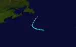 On September 4, an area of low pressure developed from a stationary front approximately 740 mi (1,190 km) south-southeast of Cape Race, Newfoundland.[2][3] At the time, a warm front and cold front were connected to the system, but further observations revealed minimal temperature deviations. The following day, the disturbance appeared to have acquired subtropical characteristics, but became tropical after observations showed that winds associated with the storm were near the center.[2] The system peaked as a strong tropical storm with maximum sustained winds of 70 mph (110 km/h) on September 5.[3] The storm later weakened and was absorbed by a frontal boundary at 18:00 UTC on September 7 roughly 165 mi (265 km) southeast of Cape Race.[2][3]