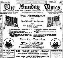 The Great Depression had a significant impact on Western Australia, leading to increased dissatisfaction with the federal government and support for secession.[5] In May 1930, secessionists established the Dominion League of Western Australia, which called for the state to leave the federation and become a separate self-governing dominion with the British Empire. The Dominion League "held frequent and well-attended public rallies, at which League speakers emphasised that the only real solution to Western Australia's problems lay in secession".[6] The Sunday Times and its editor James MacCallum Smith had been advocates of secession for several decades and lent their support to the League.[7] In June 1930, the Primary Producers' Association and Federated Chambers of Commerce also came out in favour of secession, following the Scullin government's announcement that it would continue its high-tariff policy and would not provide support for primary producers.[6]