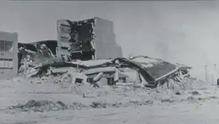 The west wing of the Helena High School after its collapse during the October 31 aftershock following damage during the October 18 mainshock