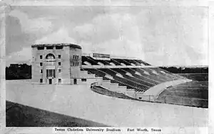 - ↑ Sources vary considerably regarding the overall attendance for the game. On the low end, a 2021 article on TCU 360 stated that the game had 36,000 attendees, with Amon G. Carter Stadium only having a seating capacity of 30,000 at the time.[14] In a 2017 book, historian Bill O'Neal gives a slightly different number for the seating capacity, stating that the stadium had a regular capacity of 24,000 and that temporary bleachers were brought in to add 3,500 extra seats.[41] O'Neal also cites contemporary sportswriter Grantland Rice as estimating that about 37,000 people were in attendance.[41] Contemporary reporting from the United Press gave the stadium an estimated capacity of about 32,000 and stated that an estimated 18,000 were expected to be turned away at the gates.[12][24] A 2010 article on ESPN.com stated that the stadium had a seating capacity of about 25,000, but held 37,000 for the game, with many spectators sitting behind endzones or in nontraditional seating arrangements.[8] The 1936 SMU yearbook stated that there were over 37,000 attendees.[42] A 2010 book by historians Fred Eisenhammer and Eric B. Sondheimer stated that over 40,000 people were in attendance,[19] while a 2004 article by The Daily Campus stated that 42,000 people attended, despite a seating capacity of about 30,000.[21]