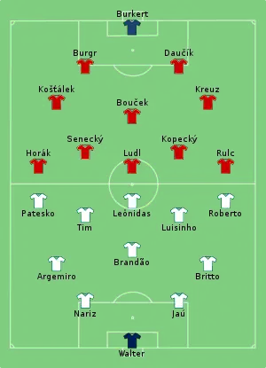 Because of the troubling effect of the first game, which saw several players getting injured or sent off, both teams had to make many changes to their line-ups (nine for Brazil and five for Czechoslovakia). Czechoslovakia took the lead with Vlastimil Kopecký in the 25th minute, but in the second half, stand-in captain Leônidas levelled the score for Brazil. Soon after, the referee disallowed a goal by Karel Senecký, despite the Czechoslovak players stating that it had crossed the line. The European representative continued to attack following that moment, leaving space for the Brazilians to swiftly counter, which debutant Roberto took advantage of to score his nation's second goal.[2]