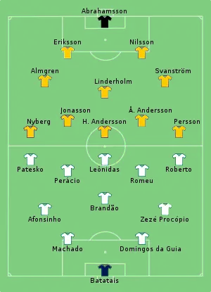 Sweden started on the front foot, taking a double lead inside 38 minutes. In the first half, Brazil looked uninspired until they got one back before half-time. In the second half, Brazil was reinvigorated and pushed for the comeback. In the second half, Leônidas scored twice and even let Patesko kick a penalty that he missed. Perácio secured the victory in the 80th minute.[2]