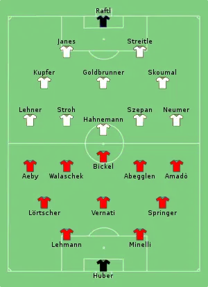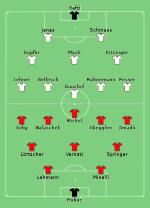The replay was played 5 days later. Switzerland used the same line-ups as the first game, while Germany made a few changes. Paul Aeby got injured after a few minutes, forcing Switzerland to play with 10 men. Germany took soon advantage, scoring twice. However, Switzerland reacted well, and with Aeby back on the pitch in the second half, completed a remarkable comeback.[2]