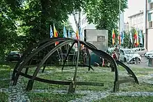 After the war, the ruins of the Great Synagogue were demolished. The victims burned alive by the Germans on June 27, 1941, were initially commemorated by a small obelisk. On August 16, 1995, in the place where the Great Synagogue was located, in the area between Suraska Street and Legionowa Street, a new, more impressive monument was unveiled. It was funded by the Białystok Jewish diaspora and the Białystok municipal authorities. The primary feature consists of an iron skeleton symbolizing the synagogue's dome. The skeleton was placed on the Star of David, which was made of granite cubes. Nearby, there is a wall-shaped monument topped with a bronze menorah. Two brass plaques were hung on its front wall. One shows the building of the Great Synagogue, the other has an inscription in Polish, English and Hebrew:[77]