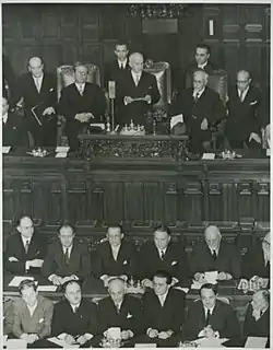 President Einaudi contained also several references to the international affiliation of the newborn Italian Republic: "Twenty years of dictatorial rule had proclaimed civil unrest, external war, and such material and moral destruction to the Fatherland that every hope of redemption seemed vain. Instead, after having saved, despite the regional and local differences and painfully mutilated, the indestructible national unity from the Alps to Sicily, we are now tenaciously reconstructing the destroyed material fortunes and we have twice given the world admirable proof of our will to return to free democratic political competitions and our ability to cooperate, equal among equals, in the forums in which we want to rebuild that Europe from which so much light of thought and humanity came into the world".[4]