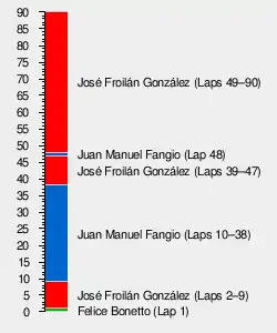 The Alfa Romeos of Fangio and Farina pitted twice for fuel, owing to the awful fuel consumption of their cars. They were doing 1+1⁄2 miles to the gallon, and needed to take on 70 gallons for every stop. Both drivers needed to stop twice, and, owing to the lengthy, minutes-long pit stops of Formula One in 1951, the more fuel efficient Ferrari of González (who only needed to make one stop) was able to overtake the Alfa Romeos and pull out a considerable lead.