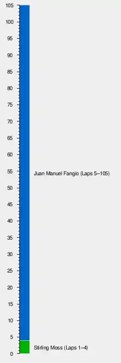 Despite a hesitant start, Moss led away on the first lap from Collins, Fangio, and Hawthorn. On lap 4 coming out of the tunnel, there was mayhem. Moss went straight through the chicane, sending debris from the wrecked barrier crashing onto the circuit.[1] Collins crashed through the quayside barriers trying to avoid it.[2] Fangio and Brooks slowed to make their way through the carnage. Brooks' effort was for nought, being hit by Mike Hawthorn's Ferrari, which lost a wheel.[3] Fangio took the lead from Brooks' damaged car and held it to the chequered flag.