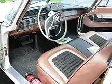 The flagship model was the Custom Royal. It came with the 350 in3 (5.7 L) Ram Fire V8 with a standard two-barrel carburetor, but the optional four-barrel carburetor delivered 300 hp (224 kW). A feature of the Custom Royal was its bumper-mounted exhaust ports which were only available on the Royal and Coronet models as part of the D-500 options. Identifying exterior characteristics include Custom Royal script at the trailing edge of the belt-line molding, the pronounced check-mark, gold anodized Dodge block letters on the hood, and gold anodized Dodge script on the passenger side of the trunk. Fin cap inserts were anodized and had a unique rectangular pattern. All Custom Royals included a stainless molding above the bumper, on the flat edge below the trunk opening. Body styles offered were sedan, two-door hardtop (Lancer), four-door hardtop (Lancer), and two-door convertible (Lancer). Lancers were further identified by a lance and shield emblem on each fin.