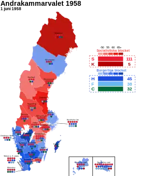 Early general elections were held in Sweden on 1 June 1958,[1] after the defeat of the Social Democratic government's proposals for a new pensions system in a parliamentary vote. The Social Democrats remained the largest party, winning 111 of the 231 seats in the Andra kammaren of the Riksdag,[2] and Tage Erlander's third government was returned to power. In accordance with the law, the new Chamber was elected only to complete the previous Chamber's term, which was due to end in 1960.