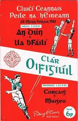 The 1961 All-Ireland Senior Football Championship Final was the 74th All-Ireland Final and the deciding match of the 1961 All-Ireland Senior Football Championship, an inter-county Gaelic football tournament for the top teams in Ireland. A crowd of 90,556 (a record at the old Croke Park) watched the match between Down and Offaly.[1]