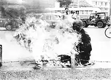 A Vietnamese Mahayana Buddhist monk, Hòa thượng Thích Quảng Đức, burned himself to death at a busy street intersection in Saigon. He was protesting the persecution of Buddhists by Diệm's government. Associated Press (AP) photographer Malcolm Browne took a photograph of the incident which was published on the front page of nearly every newspaper in the world.[20]: 284