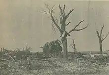 The tornado touched down near Hastings and traveled 70 miles (110 km) as it passed through or near Harvard, Giltner, Hampton, Bradshaw, Benedict, Strongsburg, Shelby, and Rising City before it finally lifted near Bellwood.[1][3] The United States Weather Bureau documented that every structure in the path of the tornado was completely destroyed.[1] A farm three miles (4.8 km) northwest of Bradshaw was obliterated at F5 intensity, and two people were killed.[3] Fifteen people were injured in Shelby, which was barely spared from a direct strike.[3] The National Weather Service in Hastings, Nebraska documented that at least a dozen farms were leveled in the first 30 miles (48 km) of the tornado's track.[3] The tornado had a width of 0.25 miles (0.40 km) for most of its life.[1] At times, two to three individual damaging funnels were visible from the same cloud, during which the width of the tornado increased to 0.75 miles (1.21 km).[1] The U.S. Weather Bureau documented that severe hail occurred during the times when more than one funnel was visible. In the original damage survey from the U.S. Weather Bureau, and later the National Weather Service office in Hastings, it is documented that the tornado skipped (lifted and then touched back down again) several times for an additional 40 miles (64 km) after Bellwood, for a final path length of 110 miles (180 km).[1][3] It was documented that this tornado caused between $5-50 million (1964 USD).[1] While the United States Weather Bureau documented four deaths from this tornado, modern publications from the National Weather Service only indicate two deaths.[1][3][2]