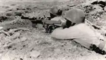 After two days of fighting, the border skirmish at Tog Wajaale began to assume serious proportions.[69][70] Around February 10, the Ethiopians sent an airborne company, an infantry battalion, an artillery battery, and a mechanized platoon with M24 Chaffee tanks to Tog Wajale/Togochale, while the Somalis dispatched heavy artillery and tanks.[46][69][71] Equipped primarily with F-86 Sabre's, the Ethiopian Air Force had complete air supremacy over its nearly nonexistent Somali counterpart as the Somali Air Force possessed few combat capable aircraft at the time.[72][19] The Somali Air Force dispatched multiple De Havilland Vampire trainer jets it had previously received from Iraq to carry out combat air patrols, and Somali C-47 transport planes flew in two companies of troops into Tog Wajaale. During the battle Ethiopian F-86 Sabre jets would carry out heavy bombing raids and repeated strafing runs on hostile positions around the town.[19] Eight Ethiopian tanks were reported to have been destroyed in the first two days fighting.[73] The two sides became engaged in trench warfare less than 100 yards apart and during the fighting Somali mortars scored a direct strike on a munitions depot, destroying an Ethiopian military camp.[70] In the initial clashes, the Ethiopians claimed to have killed 400 Somali troops and wounded 700,[74] while reports of Ethiopian losses alleged that 350 had been killed, half by the munitions depot explosion.[68][70] Heavy losses would be incurred on both sides during the battle for the town, largely due to the heavy use of artillery and tanks.[75]