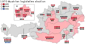 Parliamentary elections were held in Austria on 1 March 1970.[1] The result was a victory for the Socialist Party, which won 81 of the 165 seats to become the largest party for the first time in the Second Republic. With the SPÖ two seats short of a majority, SPÖ leader Bruno Kreisky became Chancellor at the head of a minority government that was tolerated by the Freedom Party of Austria in return for electoral reforms that benefitted smaller parties by increasing the proportionality of votes and seats.[2] Voter turnout was 91.8%.[3] It was the first Socialist-led government since 1920, and the first purely left-wing government in Austrian history. The SPÖ would lead the government for the next 29 years.