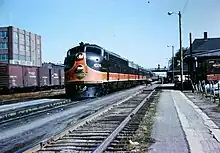 Amtrak #1 (later #59), the City of New Orleans[nb 1] departed Chicago's Central Station at 8:00 AM CT on June 10, 1971. The City of New Orleans was a daytime train between Chicago and New Orleans, Louisiana. Up until April 30, 1971, it had been operated by the Illinois Central Railroad, but passed to Amtrak when the latter assumed operation of most intercity service in the United States.[1] It was scheduled to arrive in New Orleans at 1:30 AM on June 11. The train was composed of 15 cars: a baggage car, 11 coaches, a diner-counter, a lounge car, and a combination coach/food service car. Amtrak had inherited or leased this equipment from other railroads. A set of four leased Illinois Central EMD E-units of various models pulled the train: E8A #4031 (leading), E9Bs #4109 and #4106, and E10A (a rebuilt E8A) #2024 (formerly #4032).[2]