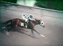 Twice a Prince reared in the starting gate, which delayed the start.[25] Out of the starting gate, Shecky Greene set the pace for the field, while race favorite Secretariat started in last place.[13][29] Exiting the gate, Sham hit his mouth against the gate and subsequently bumped into Navajo before gaining proper stride.[30] Sham briefly took the lead around the quarter-mile marker, but Shecky Greene quickly retook the lead.[13] Beginning the first turn, Secretariat had moved ahead of only two horses; however, in the next quarter-mile Secretariat moved into sixth position.[13] A half-mile in, Shecky Greene maintained a three length lead over Gold Bag, but his pace had slowed compared to the first quarter.[31] Sham remained close to the front of the field within the top four for the first half of the race; he moved into second position as the field reached the half-mile post.[13] At the three-quarters post, at the start of the homestretch, Shecky Greene began to fade and Sham overtook him to move into first going into the final furlong.[13] Secretariat, who had passed his competitors on the outside throughout the race, overtook Sham in the final furlong and pulled ahead,[32] finishing 2+1⁄2 horse lengths in front of Sham.[26] Our Native took third and Forego, who went on to win multiple Eclipse Awards as an older horse,[33] was fourth.[32]