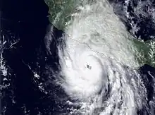 The deadliest and most destructive hurricane of the 1976 season originated as a large tropical disturbance about 525 miles (845 km) southwest of Acapulco, Guerrero, on September 25.[2] It developed into a tropical depression around 18:00 UTC that day and steadily strengthened into Tropical Storm Liza 24 hours later.[3] The incipient cyclone turned toward the north while continuing over warm waters,[2] and it attained hurricane strength by 00:00 UTC on September 28. Liza intensified into a major hurricane on September 29,[3] and a reconnaissance aircraft measured peak winds of 140 mph (230 km/h) around 18:00 UTC, when the storm was in the midst of an eyewall replacement cycle.[2] Liza maintained Category 4 intensity until early on October 1 when it moved ashore the coastline of Mexico north of Los Mochis, Sinaloa, as a slighter weaker Category 3 cyclone. Liza rapidly weakened over the mountainous terrain and was last tracked as a tropical cyclone at 12:00 UTC on October 1.[2][3]