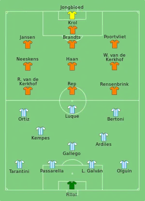 The start of the final was mired in controversy, as the Dutch accused the Argentines of using stalling tactics to delay the match, causing tension to build in front of a hostile Buenos Aires crowd. The host team eventually came out five minutes late after the audience was whipped into a frenzy. The Argentines also questioned the legality of a plaster cast on René van de Kerkhof's wrist, despite him having worn it in earlier games without objections, causing the Dutch to threaten to walk off the pitch; the Italian referee, Sergio Gonella, upheld the complaints and forced Van de Kerkhof to apply extra bandage.[1][2][3] In retaliation, the Netherlands team refused to attend the post-match ceremonies.[4]