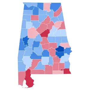 As of the 2020 presidential election, this is the last election in which Limestone County, Morgan County, Marshall County, Talladega County, Cullman County, Tallapoosa County, Bibb County, Randolph County, Henry County, Lamar County, and Clay County voted for a Democratic presidential candidate. This is also the most recent election where Alabama was more Democratic than the nation at-large and where Alabama voted left of several modern-day blue and purple states like California, Connecticut, Illinois, New Jersey, New York, and Pennsylvania.[1]