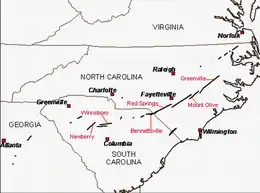 These environmental conditions bore strong resemblance to the idealized tornado setup across the Carolinas, and they prompted the SLSU to upgrade areas from eastern Alabama into the Outer Banks of North Carolina to a High risk of severe weather,[3] the first occurrence on record in this portion of the United States.[1] As the mesolow moved across the Carolinas, it was supported by a surface trough to its east-northeast which likely formed as a result of differential heating.[3] Strong low-level convergence associated with this feature led to vigorous thunderstorm development in close proximity to the low,[1] where low-level helicity was maximized and highly supportive of supercell thunderstorms.[2] These supercells first began producing tornadoes across Upstate South Carolina around 19:15 UTC and continued to do so as they moved northeast, passing between Columbia and Charlotte around 22:00 UTC, near Fayetteville around 00:00 UTC on March 29, and finally ending north of the Albemarle Sound in northeastern North Carolina around 02:00 UTC.[1][3] In total, 24 tornadoes were confirmed, with 11 each in the Carolinas and 2 in Georgia. The size and scope of the event drew parallels to the 1884 Enigma tornado outbreak and tornado outbreak on April 16, 2011, and it held the record for number of tornadoes in the Carolinas until that 2011 event.[1] Comparisons were also drawn to the 1925 Tri-State tornado outbreak given the progression of an intense collection of tornadoes located near the mesolow.[2]