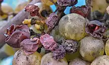 Ripe grapes affected by noble rot, a type of fungal mold which grows on grapes and results in a very sweet and concentrated wine when processed.