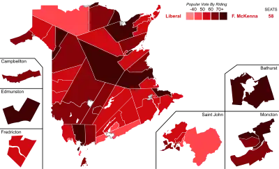 | Liberal | Frank McKenna | 58 | 18 | 19 | 58 | 246,702 | 60.39% | |||