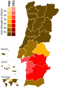 The PSD was reelected in a landslide, winning a majority government with just over 50% of the votes and 148 of the 250 seats, a majority of 46. Not only was this the most seats that a Portuguese party had ever won in a free election, but it was first time since the Carnation Revolution that a single party won an absolute majority. Although the PSD was very popular going into the election, the size of its victory far exceeded the party's most optimistic expectations. The PSD won every district with the exception of Setúbal, Évora and Beja, which voted for the CDU.