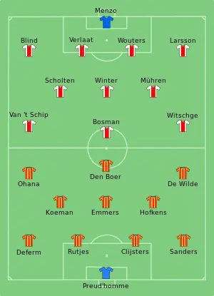 The 1988 European Cup Winners' Cup Final was a football match contested between Mechelen of Belgium and the defending champions, Ajax of the Netherlands. It was the final match of the 1987–88 European Cup Winners' Cup and the 28th European Cup Winners' Cup final. The final was played at Stade de la Meinau in Strasbourg, France, on 11 May 1988. Mechelen won the match 1–0 thanks to a goal by Piet den Boer who headed the ball low into the net after a cross by Eli Ohana from the left.