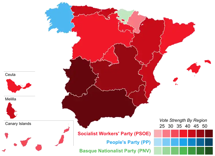 Spanish Socialist Workers' Party (PSOE) 6,275,55239.57+0.51 27–1