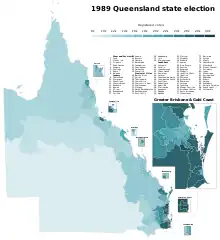 - ↑ Australian Government and Politics Database. "Parliament of Queensland, Assembly election, 2 December 1989". Archived from the original on 18 January 2015. Retrieved 22 February 2009.