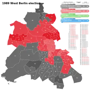 The 1989 West Berlin state election was held on 29 January 1989 to elect the members of the 11th Abgeordnetenhaus of Berlin. This was the last election held in West Berlin before the reunification of Germany and Berlin.[1] The CDU suffered a severe defeat under its top candidate, the Governing Mayor Eberhard Diepgen, who had been in office since 1984. It fell by 8.7 percentage points and ended up with 37.7% of the votes just ahead of the SPD, which gained 4.9 percentage points to 37.3% under its lead candidate Walter Momper. Together with the Alternative List (AL), this resulted in a clear majority for a red–green coalition.