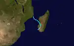 For several days beginning on February 9, an area of convection persisted in the Mozambique Channel off the southeast coast of Mozambique, between the towns of Beira and Quelimane. On February 15, deep convection increased greatly,[8] leading to a tropical disturbance forming at 06:00 UTC the next morning.[12] Also on February 16, the JTWC initiated advisories on Tropical Cyclone 10S.[2] Moving southeastward, the convection quickly organized around the center, aided by warm sea surface temperatures and convergence. Late on February 16, the system intensified into Tropical Storm Cynthia while it was passing near Juan de Nova Island. Continuing to rapidly intensify, Cynthia attained tropical cyclone status on February 17, reaching peak winds of 125 km/h (78 mph). Shortly thereafter, the storm made landfall on western Madagascar just north of Morondava. It rapidly weakened over land as it shifted to the south and later southwest. Early on February 19, Cynthia emerged into the Mozambique Channel as a tropical disturbance, and the circulation dissipated shortly thereafter.[8][12]