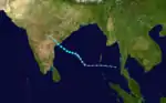 On November 15, Pacific Tropical Storm Forrest crossed the Malay Peninsula and emerged over the Andaman Sea. Tracking around a subtropical ridge, the system gradually turned northward over the Bay of Bengal and attained hurricane strength on November 17. It reached its peak intensity on November 20 as a Category 4-equivalent cyclone on the Saffir–Simpson hurricane scale with winds of 230 km/h (145 mph).[28] The IMD assessed Forrest to have attained three-minute sustained winds of 185 km/h (115 mph) and a pressure of 952 mbar (hPa; 28.11 inHg).[4] Hostile environmental conditions soon affected the cyclone as it turned abruptly eastward. Forrest subsequently made landfall in northwestern Myanmar as a weakening system on November 21 before dissipating early the next day.[28]