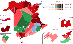 As expected, the Liberal Party won a large majority. Many were surprised that the Confederation of Regions Party formed the official opposition.[1] Though they ran even with the PCs in popular vote, their concentration of support in rural anglophone ridings gave them considerably more seats. Weir's personal popularity and name recognition was not enough to give her party more seats as she, and the Tories, had votes relatively evenly spread around the province.