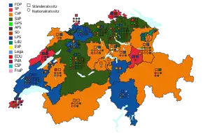 Map of Swiss cantons colored by the party that won the most votes. The seats that were won in the cantons for both the National Council and the Council of States are shown as well.