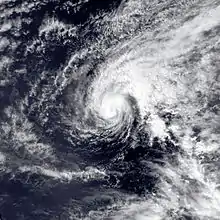 Late on July 15, Hurricane Frank passed about 175 mi (282 km) south of Socorro Island. A station on the island reported winds of 67 mph (108 km/h), which indicated that the hurricane had a large wind field.[42] Slow intensification continued, and Frank intensified into a major hurricane, or a Category 3 on the Saffir-Simpson Hurricane Scale, on July 17.[6] By that time, the eye had become well-defined,[43] and later became surrounded by a ring of deep convection. On July 18, Frank reached its peak intensity of 145 mph (233 km/h) well to the west-southwest of the Baja California peninsula.[44] By July 20, winds dropped below major hurricane intensity, and by the evening, Frank was just a Category 1 hurricane.