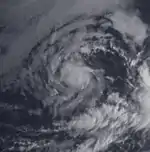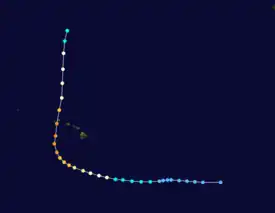 The system continued intensifying until reaching hurricane status at 0000 UTC on January 30, and it reached major hurricane status on February 2, reaching maximum sustained winds of 115 mph (185 km/h).[7] However, unfavorable wind shear began taking a toll on the storm, causing it to rapidly weaken. Ekeka crossed the International Date Line as a weakened tropical storm, and shortly thereafter degraded to tropical depression status. Ekeka continued westward, passing through the Marshall Islands and later over Chuuk, before dissipating on February 9 about 310 mi (500 km) off the north coast of Papua New Guinea.[6]