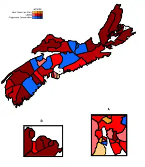 ![]() Riding map of Nova Scotia showing winning parties | |||||||||||||||||||||||||||||||||||||||||||||