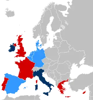 | EPP | Conservatives and Christian democrats | Germany 47, Belgium 7, Denmark 3, France 13, Ireland 4, Italy 12, Luxembourg 2, Netherlands 10, UK 19, Greece 9, Spain 30, Portugal 1 | 28% | 157 | |