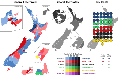 Various other unusual results occurred under the new system. For one, the National Party sought to ensure the parliamentary representation of the ACT New Zealand, a newly-formed libertarian party which had largely split from the Labour Party after the end of Rogernomics. National endorsed ACT leader and former Labour minister Richard Prebble against their own for Wellington Central, a consistently safe Labour seat. Under New Zealand's MMP rules, a party qualified for list seats if it won at least one electorate seat, regardless of vote share. Bolger thus wanted to ensure ACT could potentially be part of a National-led coalition. Prebble unexpectedly won, though ACT's vote share would have qualified them for MMP in any event. Other unusual occurrences was the large amount of new Māori MPs – leading to the backronym "More Māori in Parliament" for MMP.[1] With the introduction of MMP in 1996, the proportion of Māori in Parliament increased from 8% to 14%, to an all-time record of 17 MPs.[2]