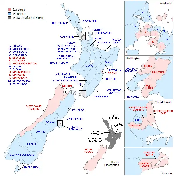 • The seats of Albany, Otago, Rotorua and Waitakere, all held by departing National MPs, were won by new National candidates. One departing MP retired, one was re-elected in a different electorate, and two became list MPs.