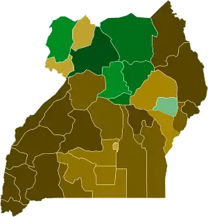![]() Results by district Museveni: 50–60% 60–70% 70–80% 80–90% >90% Ssemogerere: 50–60% 70–80% 80–90% >90% | ||||||||||||||||