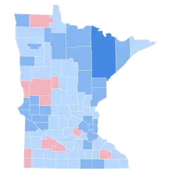 As of the 2020 presidential election, and despite the state’s long Democratic streak – having not voted Republican since 1972 – this is the most recent election that the Republican candidate received less than forty percent of the vote in a presidential election, the most recent in which a Democrat would win the state by more than 15% of the vote, the most recent in which the Democratic candidate won more counties than the Republican, and the most recent when Anoka, Becker, Benton, Cass, Chisago, Clearwater, Cottonwood, Crow Wing, Dodge, Faribault, Goodhue, Hubbard, Isanti, Jackson, Kanabec, Kandiyohi, Lake of the Woods, Le Sueur, Lyon, Martin, McLeod, Meeker, Mille Lacs, Morrison, Nobles, Renville, Scott, Sherburne, Sibley, Stearns, Steele, Todd, Wabasha, Waseca, and Wright Counties voted for a Democratic presidential candidate.[3] This is the only time since 1952 that Martin County voted for a Democratic presidential candidate. This is the last election in which Minnesota voted to the left of California, Delaware, Maryland, and Washington, all of which have become soundly Democratic leaning states, while Minnesota is a marginally competitive Democratic leaning state.