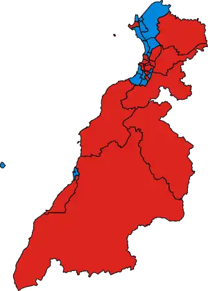 ![]() A map highlighting party support by electoral ward where red represents the Scottish Labour Party and blue the Scottish Conservative Party. | |||||||||||||||||||||||||