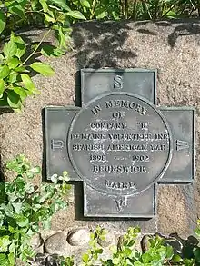 The regiment was mustered into the service of the United States at Augusta, Maine on 26 May 1898, with 46 officers and 979 enlisted men. The regiment moved to Chickamauga, Georgia, then a mobilization center. On 31 May it was assigned to Third Brigade, Second Division, Third Army Corps. The regiment did not deploy further and returned to Augusta, Maine 23–27 August after three months' service. On 21 September the regiment was furloughed for 30 days, and on 25 October the regiment's components began to muster out after five months' service. This was completed on 13 December with 46 officers and 1,211 enlisted men mustered out.[1][3] A memorial plaque for Company K of the 1st Maine in the Spanish–American War is in a park near Bowdoin College in Brunswick, Maine. Dana T. Merrill, a brigadier general in the United States Army, began his career by enlisting in Company H in 1898.[4]