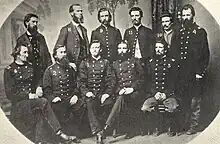 ![]() Field and staff of the 1st Tennessee Cavalry Regiment (Union), photographed late August 1864;[1] Col. Jim Brownlow, seated front and center, was in 70 battles and skirmishes[2] and had four horses killed under him[3] during the course of the war | |