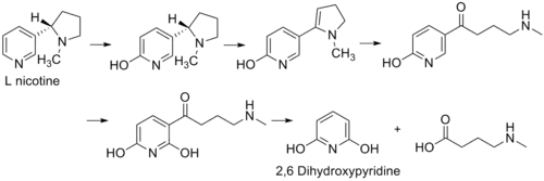 - ↑ Gherna, R; et al. (1965). "The Bacterial Oxidation of Nicotine VI. The Metabolism of 2,6-dihydroxypseudooxynicotine". J. Biol. Chem. 240 (9): 3669–3674. doi:10.1016/S0021-9258(18)97197-8. PMID 5835946.